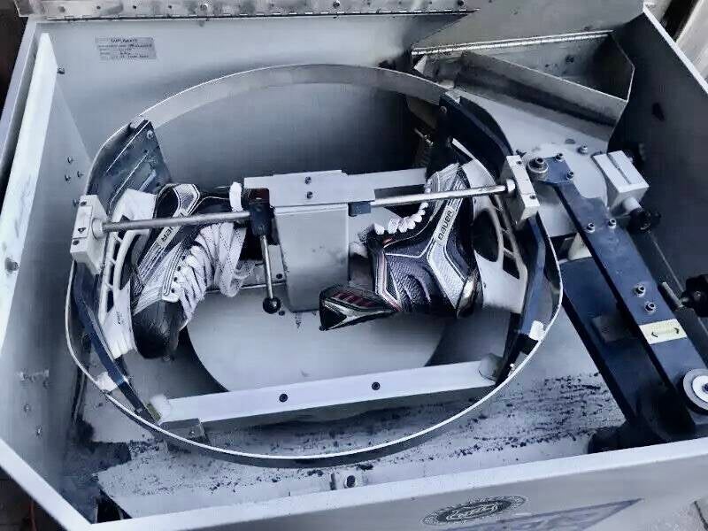 Automatische Schleifmaschinen für Schlittschuhe führen den Schleifvorgang nach Vorgaben selbsttätig aus.