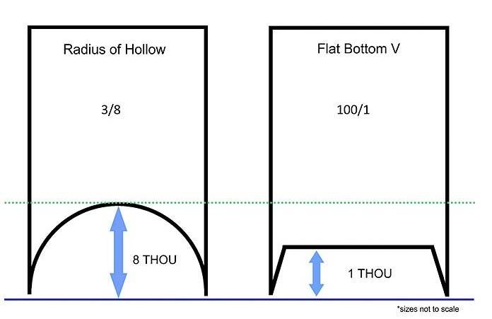 Gegenüber dem normalen Hohlradius wird der Kantenschenkel nicht in eine Rundung weitergezogen, sondern mit einer Fläche begrenzt. Das verhindert ein zu tiefes einsinken im Eis. Die erste Zahl ist die Breite der Fläche. Angegeben in Tausendstel Inches. Die Schenkelhöhe der Kante wird mit der zweiten Zahl angegeben. /1 ist die höchste, entspricht einem Tausendstel Inches. /75 ist die mittlere, 2/3 von einem Tausendstel und /50 ist die kleinste, 1/2 von einem Tausendstel. Im Grössenvergleich ist /1 etwa so hoch wie das dickste Druckerpapier. Die Breite der Fläche gibt es von 70/1000 bis 100/1000. Aus beiden Massen ergibt sich der Kantenwinkel.