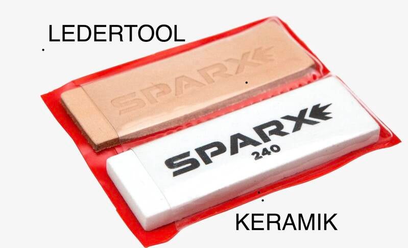 SPARX Set Leder-Keramik. Mit jeder neuen SPARX Schleifmaschine wird ein Set mit einem glatten Keramikstein und einem Lederstück mitgeliefert. Das ist eine gute Ausstattung für den nötigen Kantenfinish. Mit seiner feinen Struktur ist der Stein für beschichtete Kufen sehr gut geeignet. Mit dem Leder anschliessend die Kante ausgleichen. Eine sehr gute Möglichkeit für beschichtete Kufen.