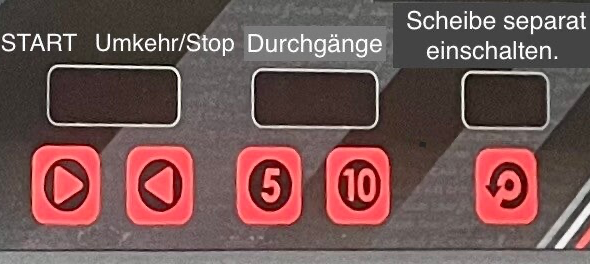 Mit "START" Wird der Vorgang eingeschaltet. Nach Ablauf stoppt dieser automatisch. Mit "UMKEHR" kann vorzeitig beendet werden. Die Anzahl Durchgänge sind festgelegt auf "5" oder "10" zum anwählen. Das letzte Zurücklaufen jeder Serie erfolgt langsam für ein feines Schleifbild. Für Einstellen usw. kann die Scheibe separat eingeschaltet werden.